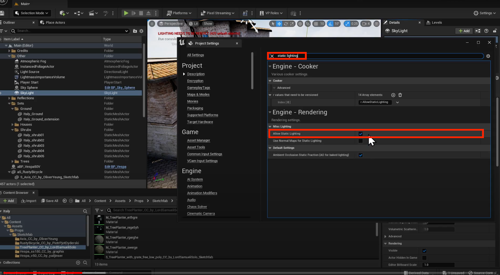 Static Lighting | Check ✅ | Open the following menu: Edit → Project Settings … On the left, navigate to: Engine Settings Rendering Sub-settings In the Misc Lighting section, check “Allow Static Lighting” |