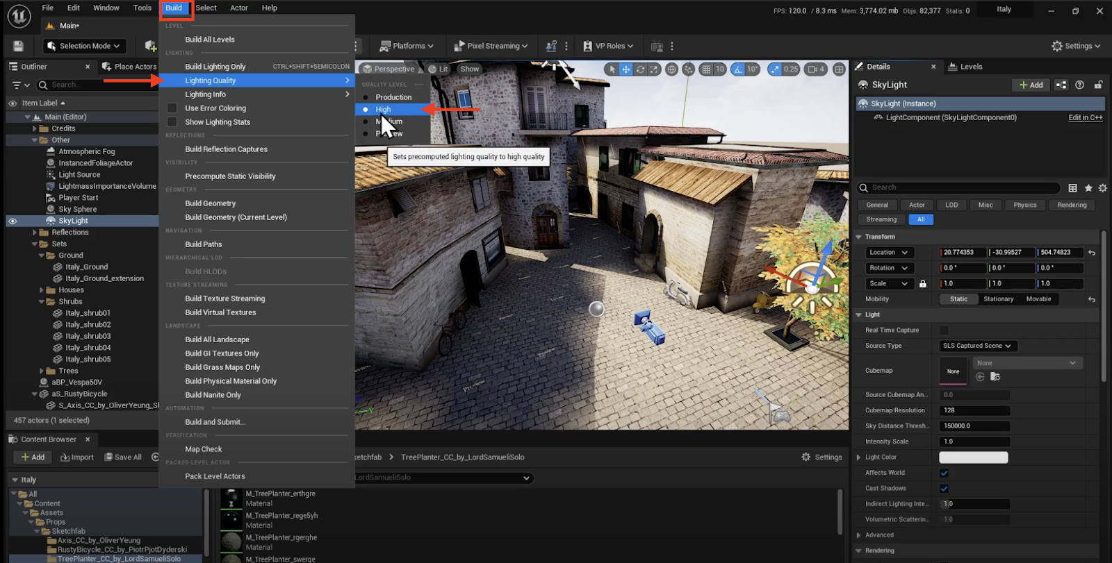 Next, under the Build Menu, select the desired lighting quality for your project. We recommend using 'Production' lighting quality for the final pass, so that the lightmap textures have the least amount of noise and artifacting as possible.