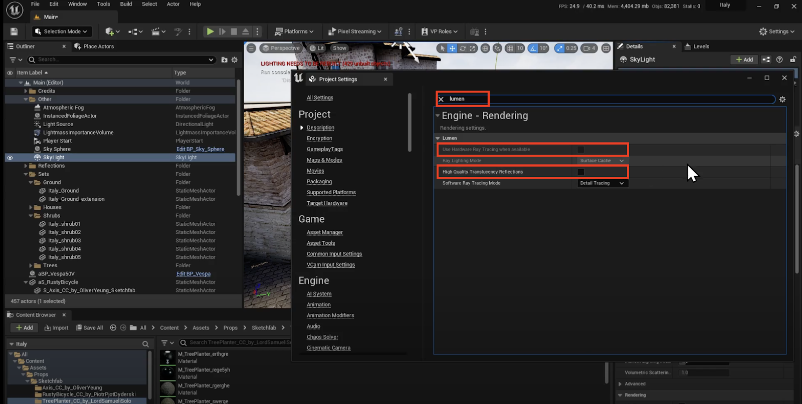 Lumen | Uncheck ❌ | Open the following menu: Edit → Project Settings … On the left, navigate to: Engine Settings Rendering Sub-settings In the Lumen section, uncheck “Use Hardware Ray Tracing when available” |