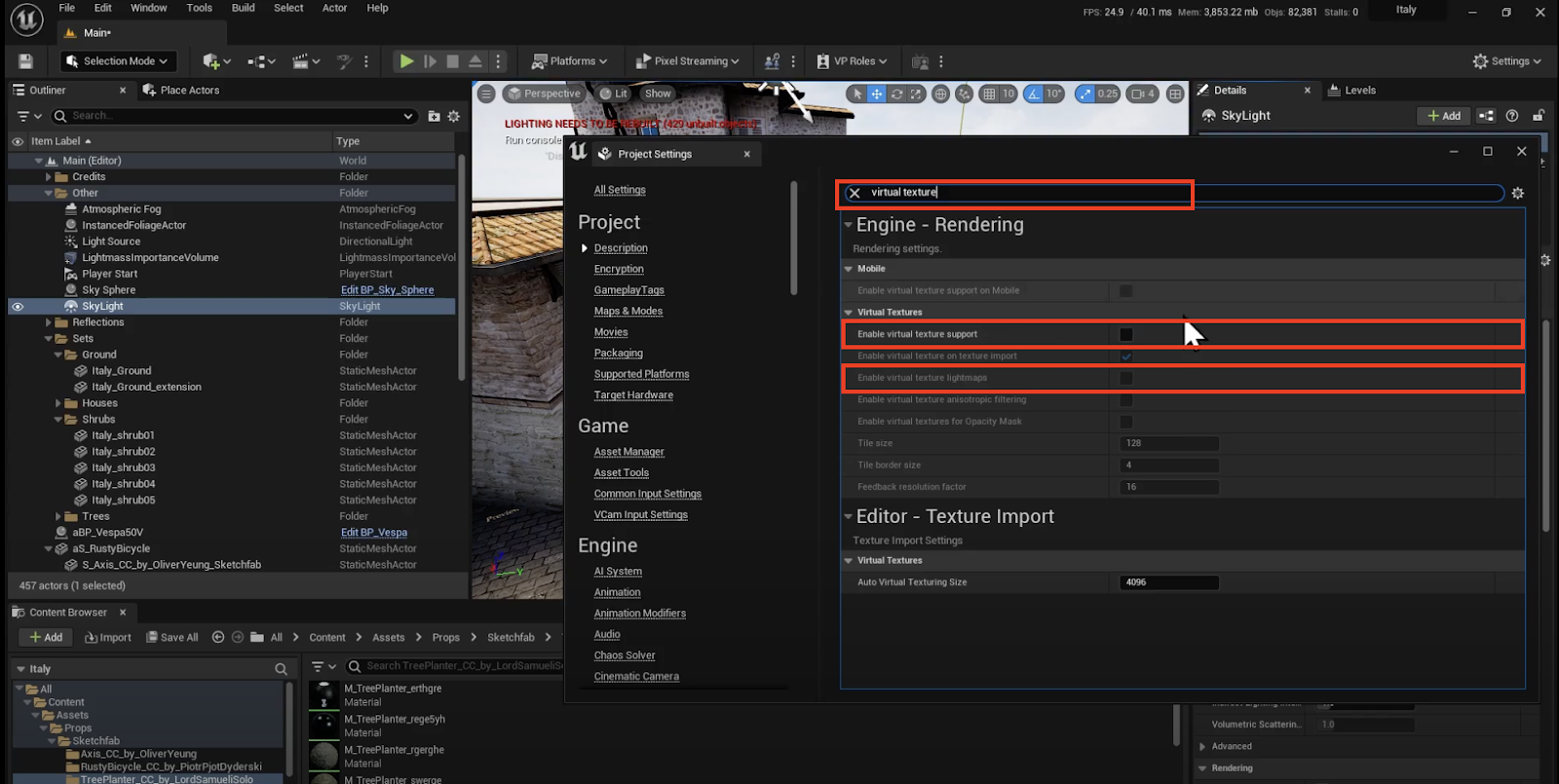 Virtual Texture Support | Uncheck ❌ | Open the following menu: Edit → Project Settings … On the left, navigate to: Engine Settings Rendering Sub-settings In the Virtual Textures section, uncheck “Enable virtual texture support” |