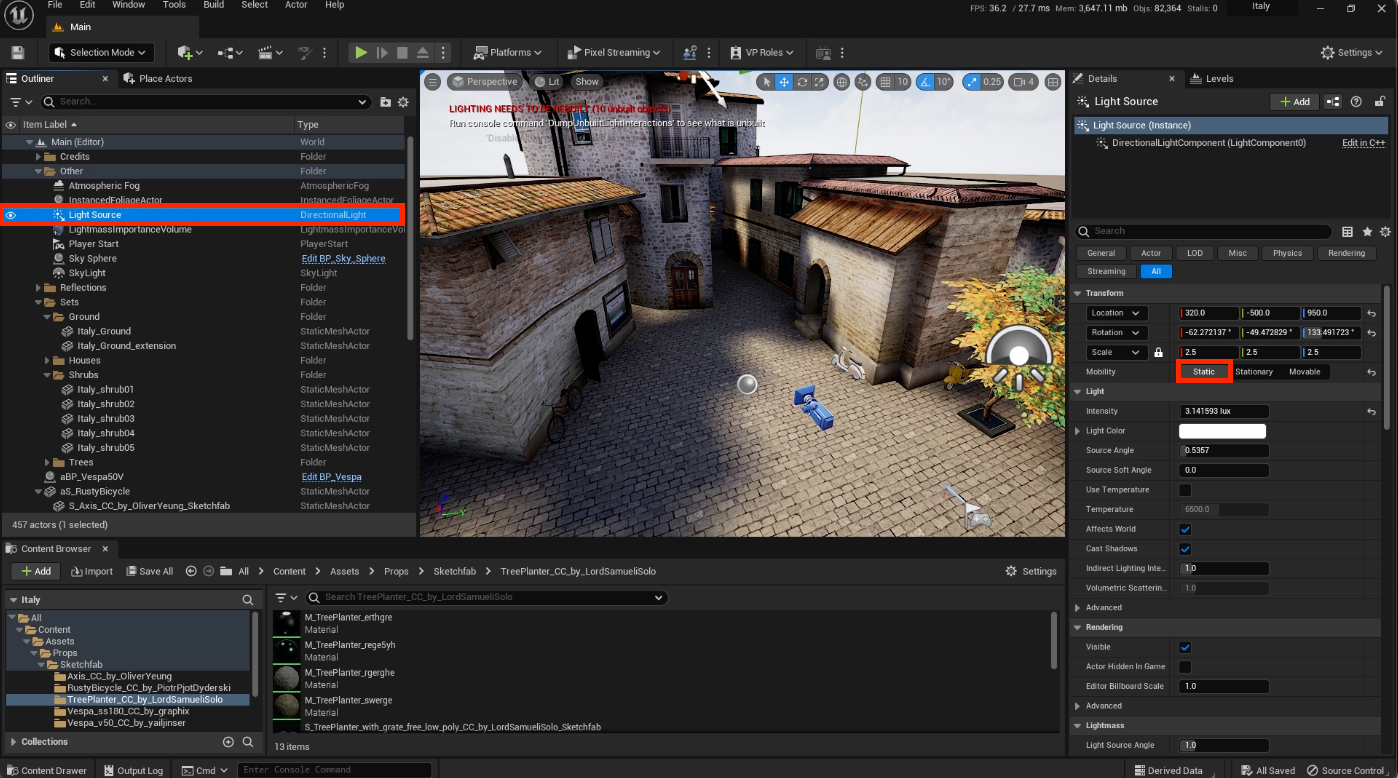 Begin by checking all the lights in your scene to ensure they are set to “Static”, as demonstrated below.