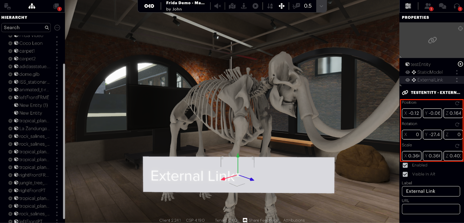 The transforms can be used to place the External Link Component anywhere in the space relative to the parent Entity.