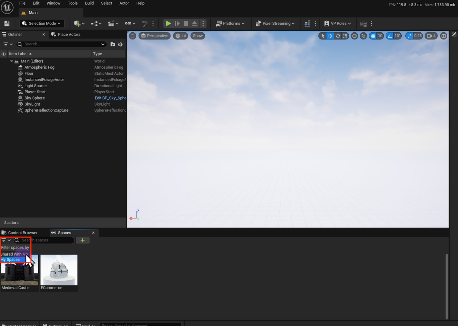You can dock the spaces tab anywhere in your Unreal Editor layout.