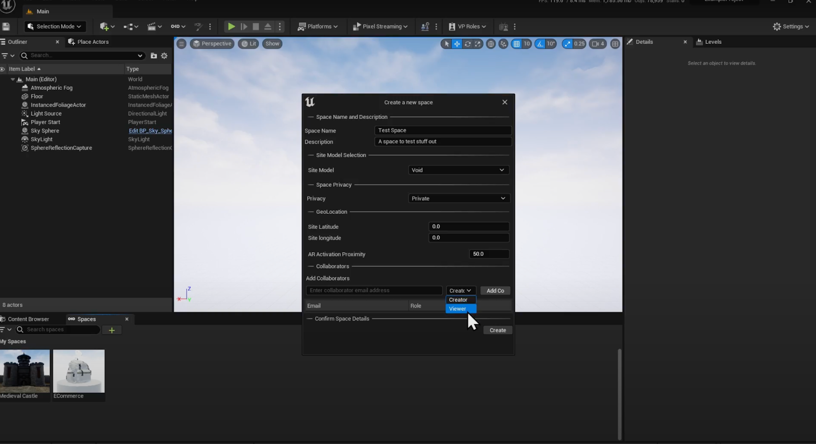 A Creator is a user who has access to edit and collaborate in the space, while a Viewer can only experience the space, they cannot make modifications to it. Once you’ve chosen the role, remember to click on “Add Collaborator”.