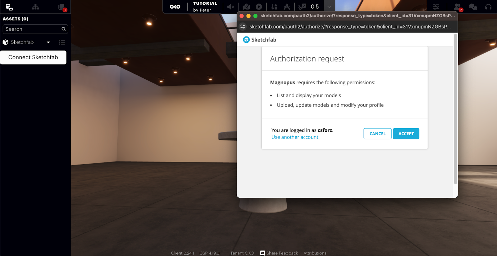 To connect your account, click the “Connect Sketchfab” button and the following window will pop up.