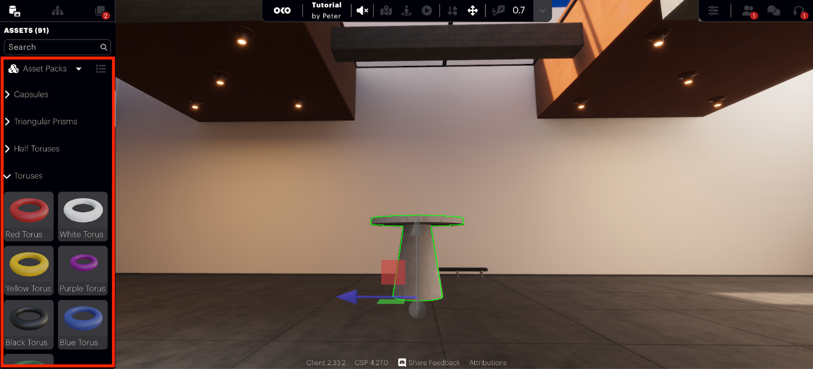 Lastly, in the “Asset Packs” dropdown you will find some basic primitives ready for you to start populating your environment.