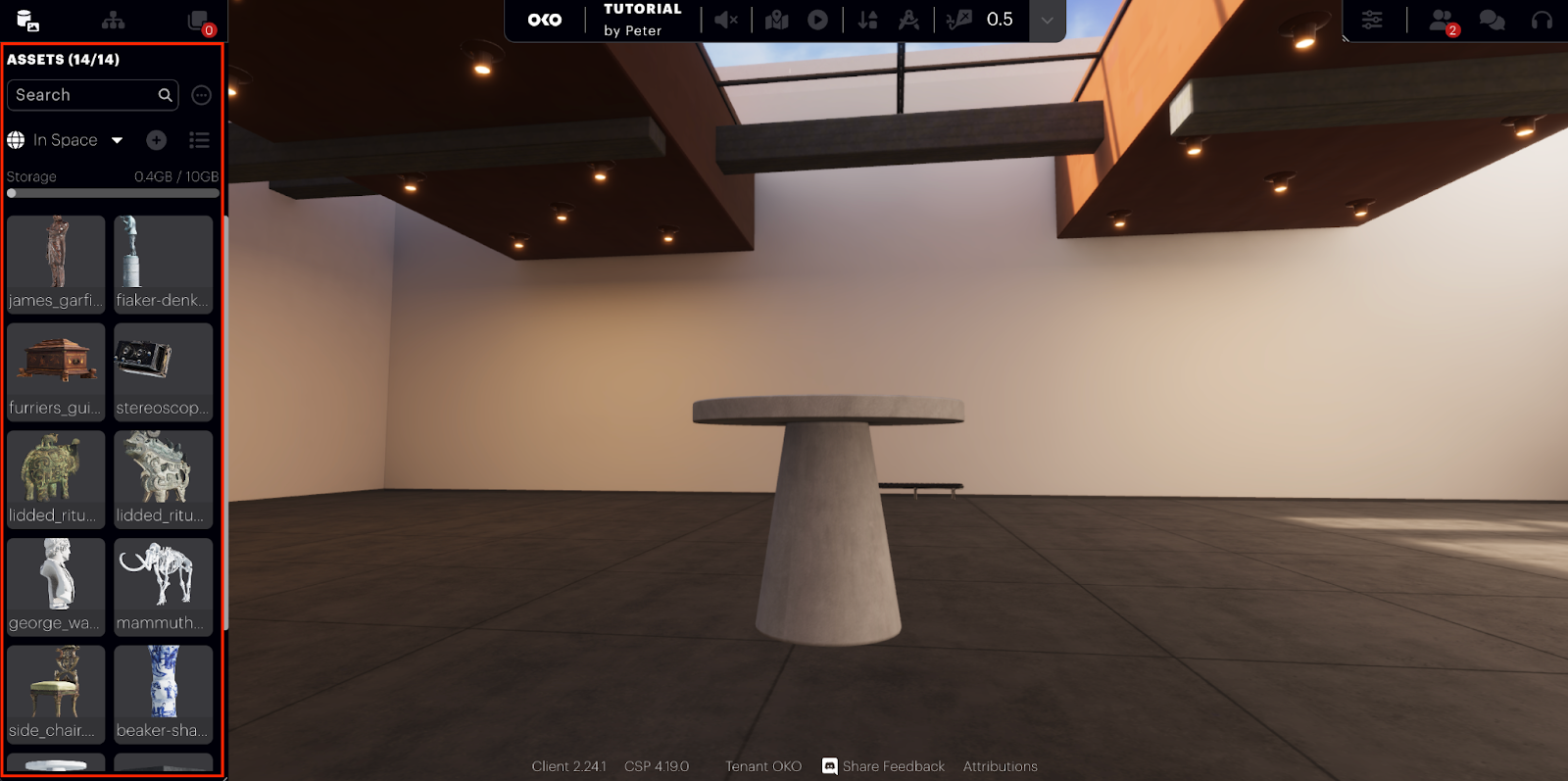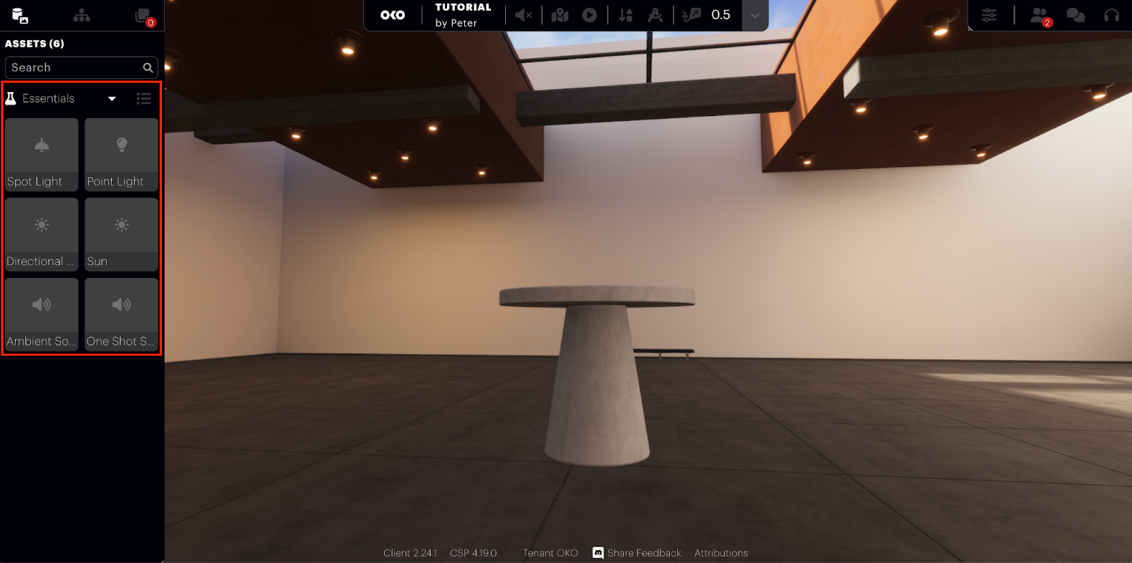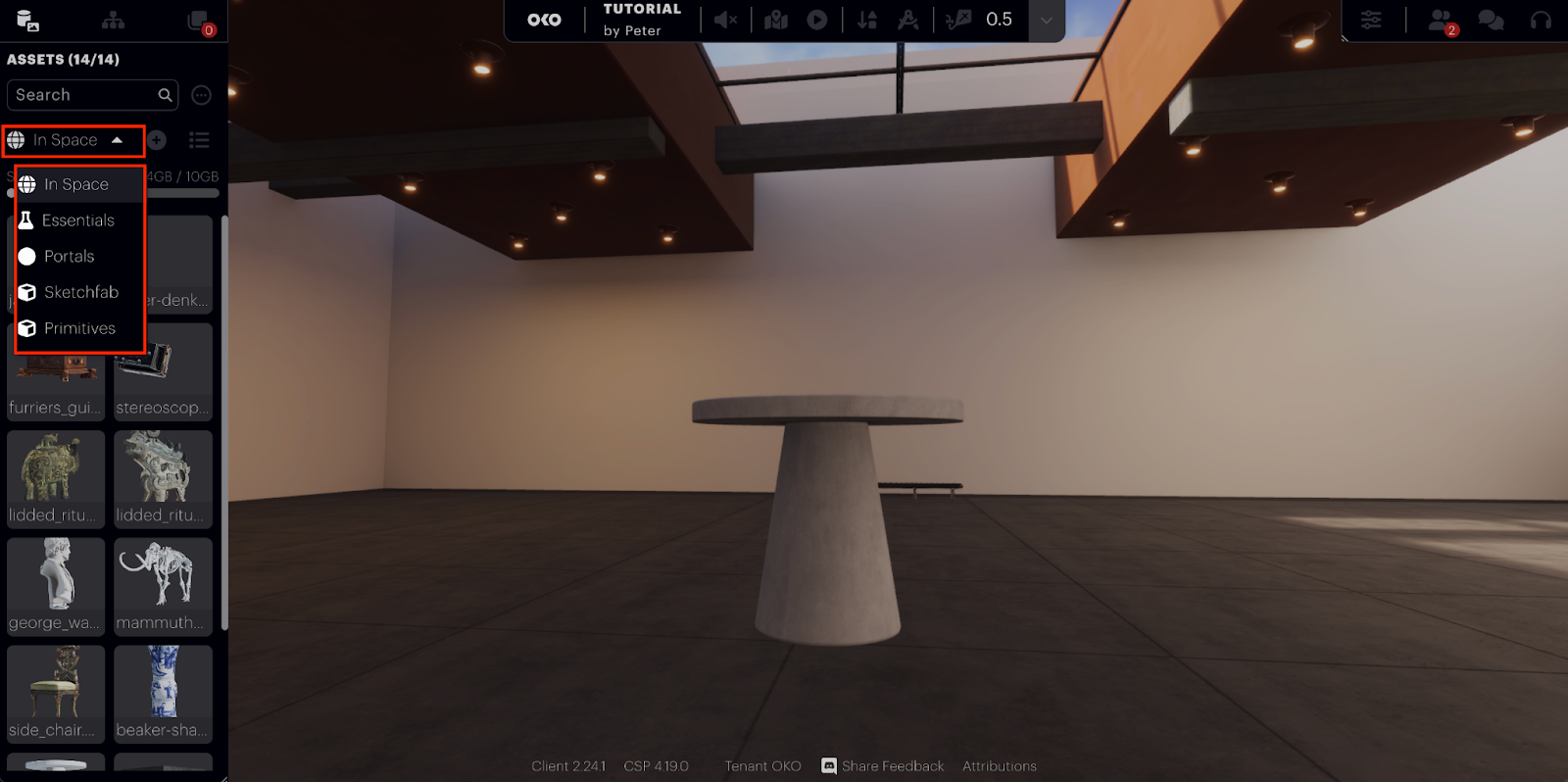 In addition to being able to upload your own custom assets, OKO also offers a selection of essential assets and primitive objects to get you started. If you select the “In Space” dropdown you will see several options.