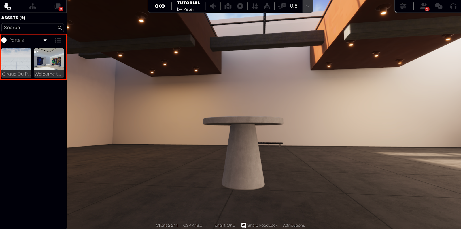 The “Portals” sub-option allows you to add portal objects to your environment. These portals enable a user to travel between spaces you have authored, connecting multiple spaces together in an experiential flow.
