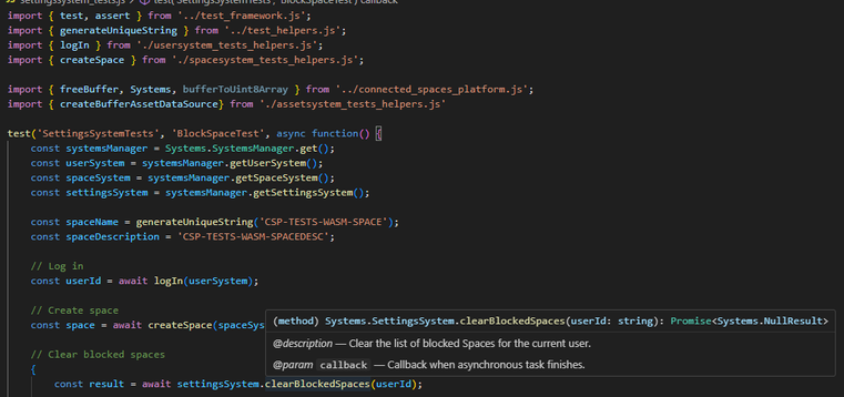 The CSP WASM JavaScript API now includes inline documentation for the public API. The inline documentation is captured and processed via the CSP wrapper generation pipeline in the same manner as with C#. The code is formatted such that it will automatically be picked by most IDEs as a helpful tooltip.