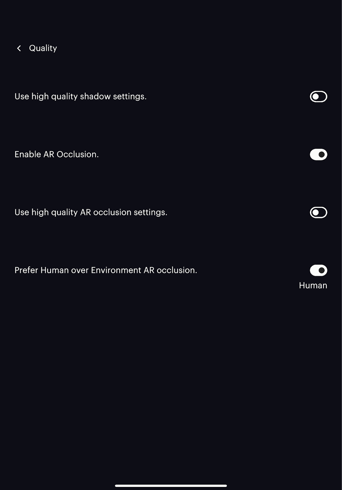 Prefer human over environment AR occlusion – with this option enabled, human occlusion of virtual objects will be prioritized over environment occlusion.
