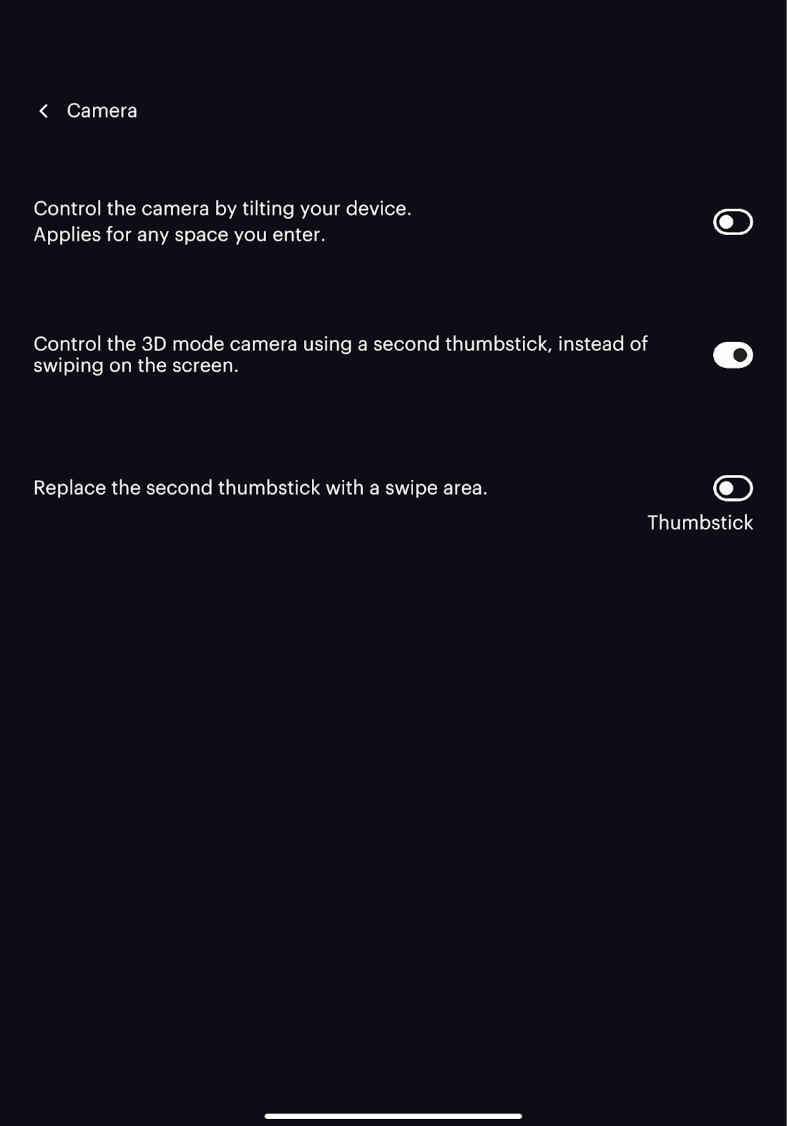 Control the 3D mode camera using a second thumbstick, instead of swiping on the screen – with this enabled, the user will have a second thumbstick to orient the camera.