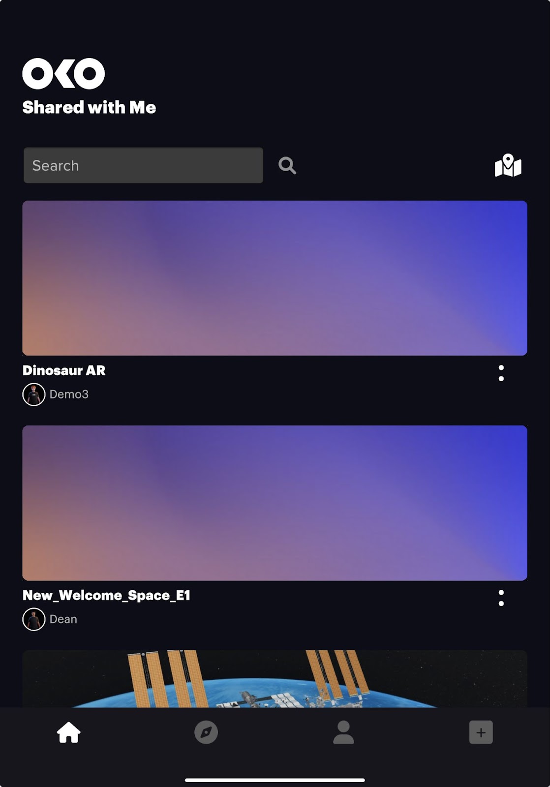 Shared With Me By default, the first page you see will be the Shared with Me page, which lists all of the spaces that have been shared with you by other creators. Each space is displayed with its name, the name of its creator, and a thumbnail image. | |