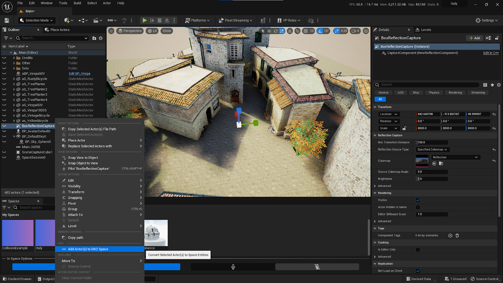 Right-click on “BoxReflectionCapture” and select “Add Actor(s) to OKO Space”.