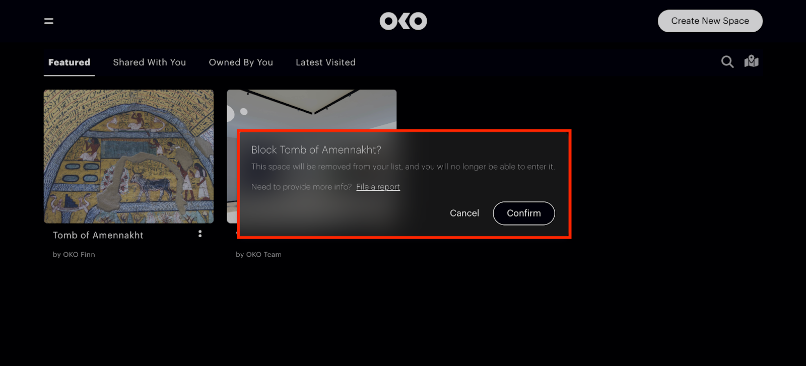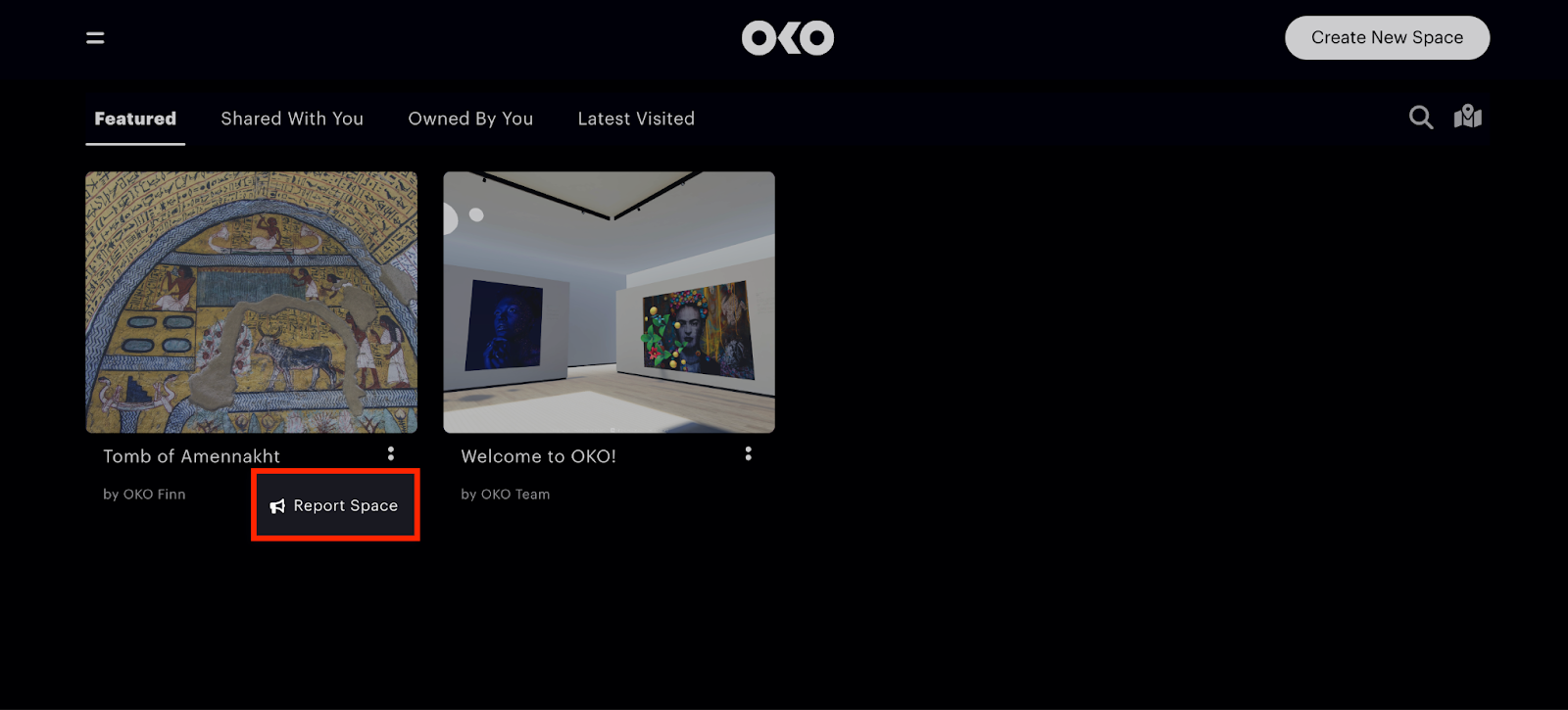 Once you have logged into OKO, you should be able to see all public and private spaces. You can report any space you have been invited to. You cannot report your own spaces.