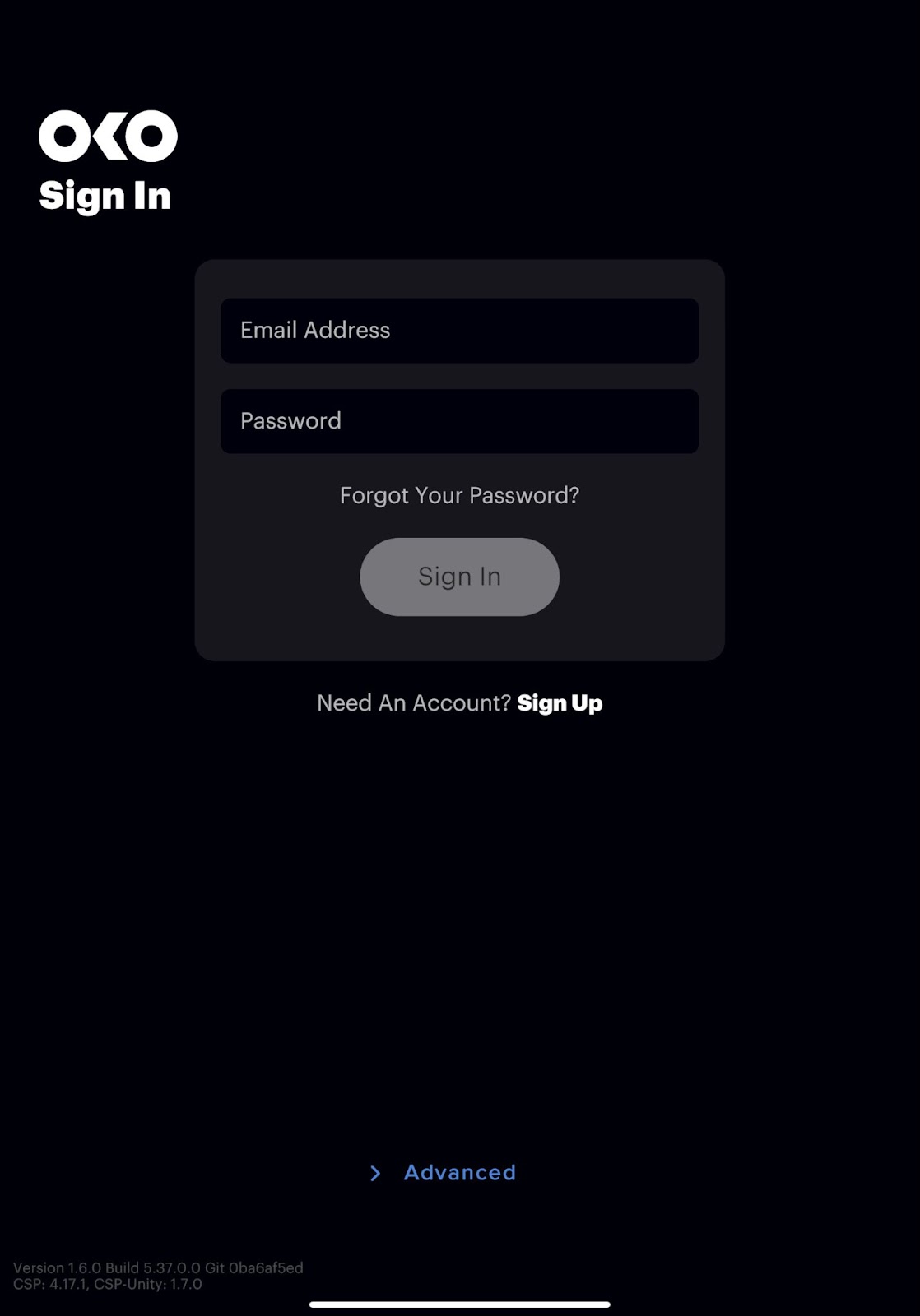 After launching the OKO app, you will be prompted to either “Sign In” or “Sign Up”.