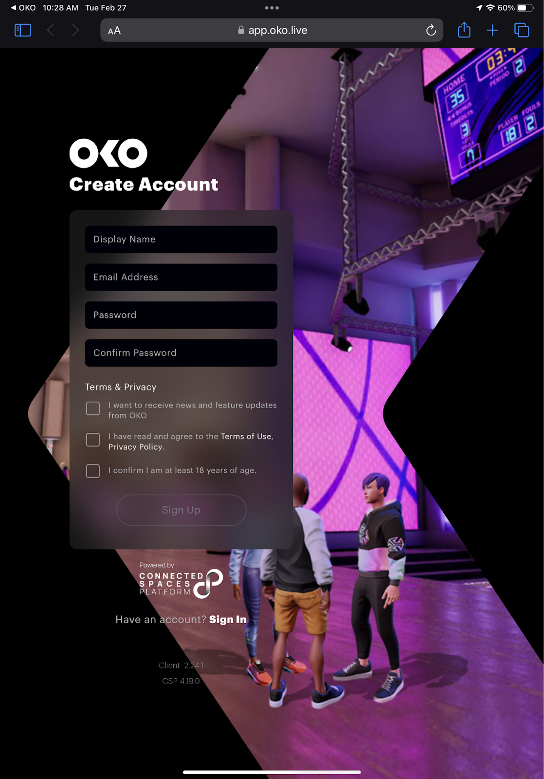 If you are a first-time user, select "Sign up" and you will be redirected to the OKO webpage. Here you can enter your display name, an email address, and create a password.