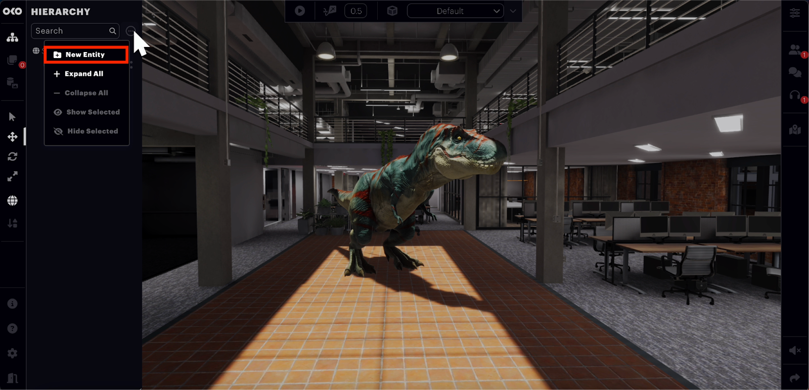 Begin by adding an empty Entity to the space from the Hierarchy menu, by clicking the three-dot menu to the right of the Search bar and selecting ‘New Entity’
