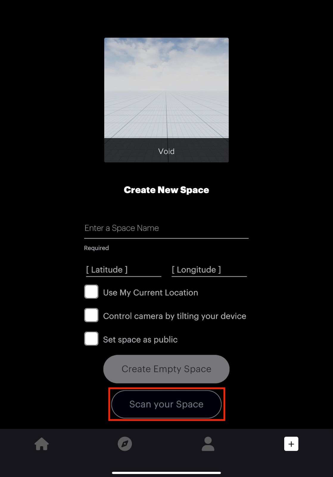 When creating a new space, you will have the option to “Scan Your Space”. This allows you to create a digital model of the environment you are currently in.